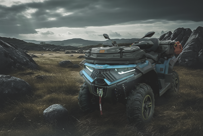 *La face avant du GOES XWOLF 700 rappelle l’air d’une bête sauvage, et les lignes du bumper intégré lui donnent un sens de puissance et de robustesse. Le feu arrière LED linéaire et complet est esthétique et technologique. Les clignotants intégrés avant et arrière apportent une modernité au XWOLF 700. Trois coloris sont disponibles : noir, orange et bleu *Sa capacité off-road est optimisée grâce à des suspensions indépendantes à double bras croisés avant et arrière, réglage des amortisseurs hybrides huile et gaz, course avant et arrière plus large. Les roues en alliage d’aluminium léger associées à des pneus tout terrains permettent un contrôle du véhicule sans pareil. Le treuil du XWOLF 700 peut tracter jusqu’à 1360kg, commandable depuis le guidon, et le quad peut, lui, tracter jusqu’à 800kg grâce à sa boule d’attelage.