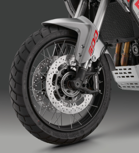 Le châssis de la SRT 600 SX Touring est équipé d'une fourche inversée Marzocchi à l'avant et d'un mono-amortisseur hydraulique à l'arrière, assurant une tenue de route précise et un confort optimal. Le système de freinage comprend des étriers radiaux Brembo avec un double disque de 320 mm à l'avant et un disque de 260 mm à l'arrière, tous deux équipés de l'ABS pour une sécurité accrue. Les pneus Metzeler, de dimensions 110/80-19 à l'avant et 150/70-17 à l'arrière, offrent une excellente adhérence sur diverses surfaces.